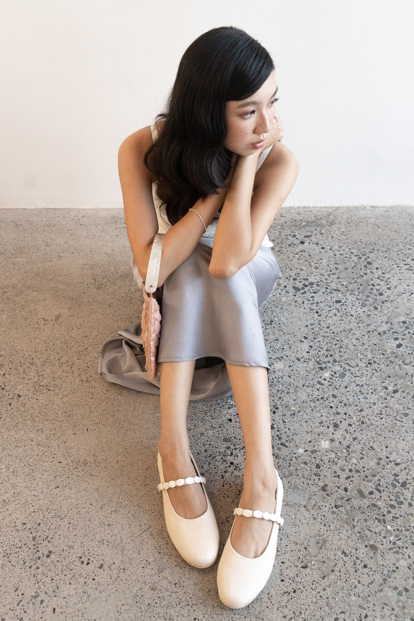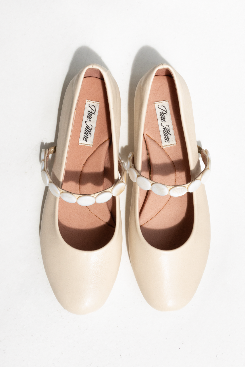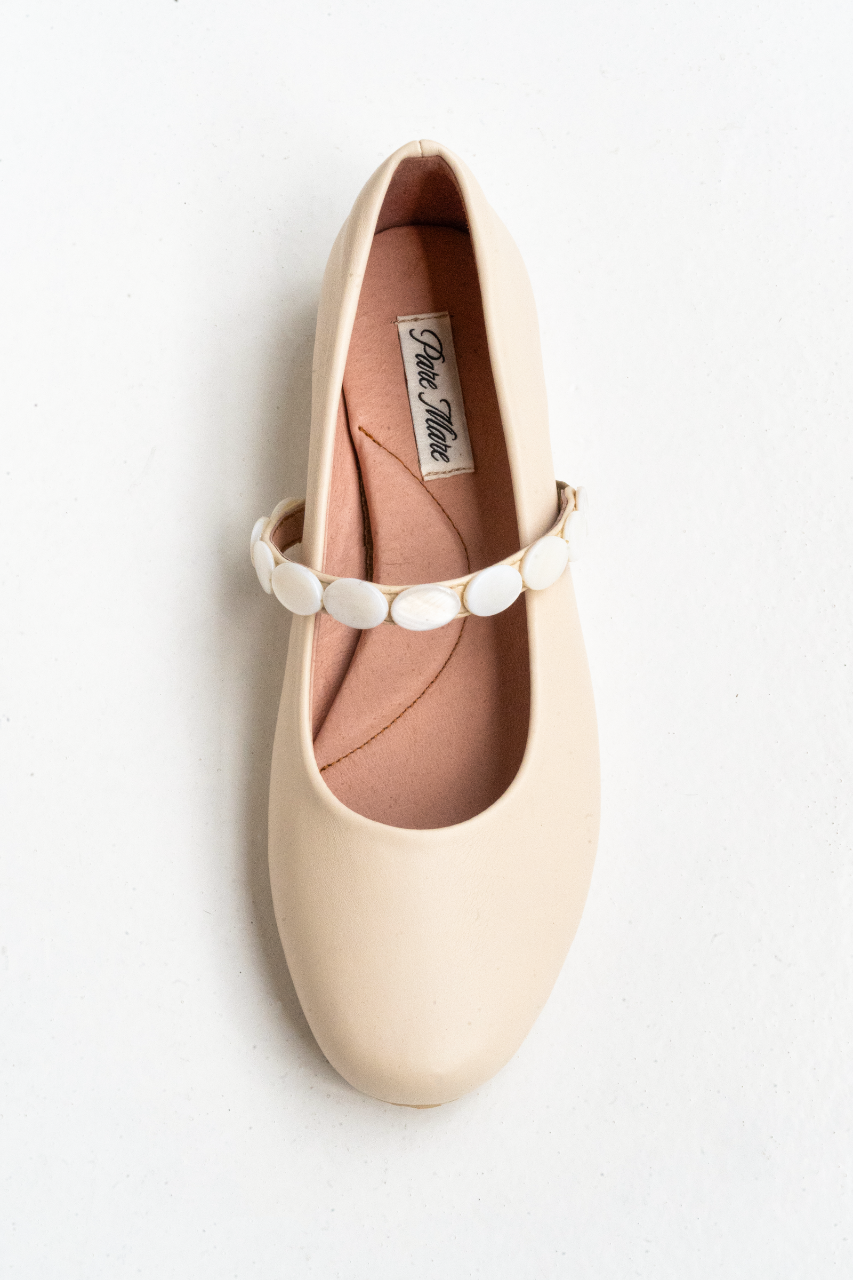 A classic Mary Jane reimagined in a soft light beige finish. The signature strap is covered in opal-shaped Capiz shells, adding texture and subtle dimension. Designed with a flat sole for all-day ease, it’s a modern update to a timeless style.